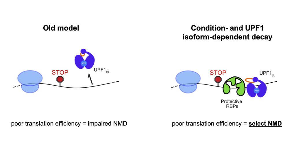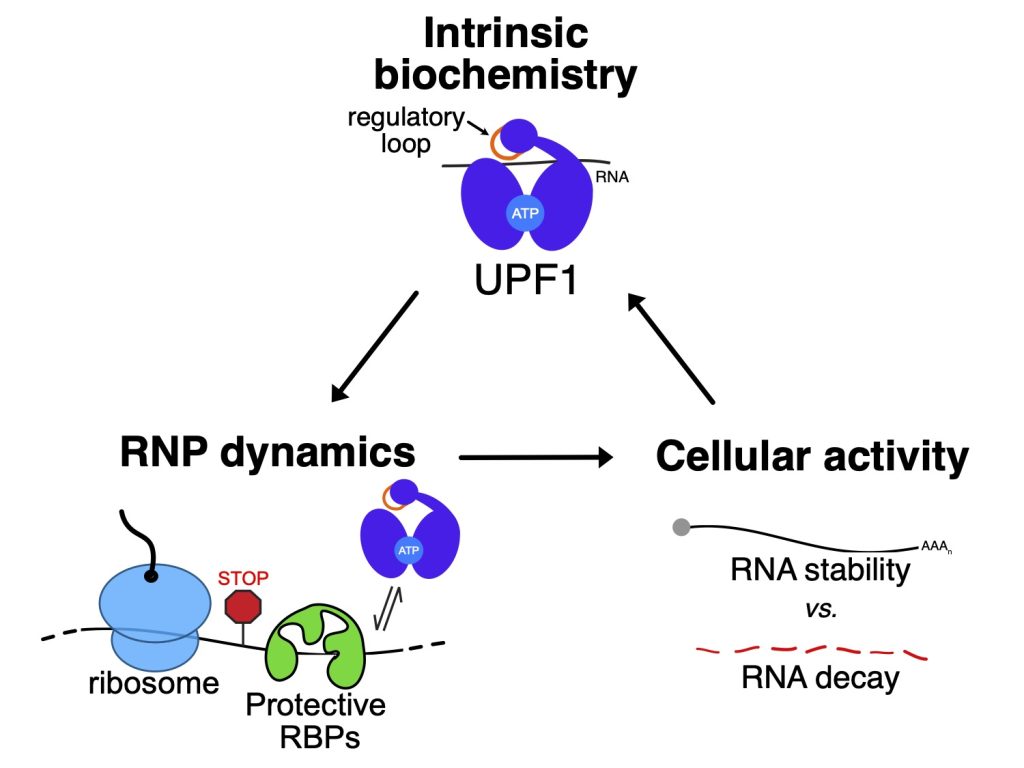 An estimated one third of human genetic diseases are affected by NMD, yet there are no FDA-approved strategies to modulate this RNA decay pathway. This unmet need is due to our poor understanding of the basic mechanisms by which RNAs are selected for NMD and the step-by-step process by which substrates are decayed. Leveraging biochemical, genetic, cellular, and molecular techniques, we aim to define the mechanism by which the UPF1 regulatory loop controls NMD target selection.