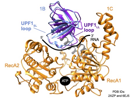 The UPF1 regulatory loop is a conserved 11 amino acid structural element within the helicase core. The loop intrudes on the RNA binding surface, causing UPF1 to release RNA upon ATP hydrolysis. Interestingly, mammals express two UPF1 isoforms that differ only in the length of the regulatory loop: a UPF1 “short loop” isoform (UPF1SL), which harbors the 11 amino acid regulatory loop, and a UPF1 “long loop” isoform (UPF1LL) with an extended regulatory loop of 22 amino acids. The longer UPF1 regulatory loop isoform has increased catalytic activity and a higher affinity for RNA in the presence of ATP than the shorter UPF1 regulatory loop isoform. In her postdoctoral work, Professor Fritz discovered that the distinct biochemical properties of the longer UPF1 regulatory loop results in differential NMD substrate specificity in human cells.